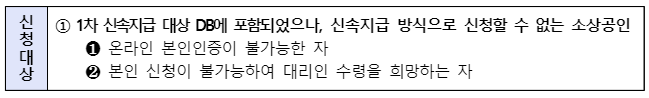 ① 1차 신속지급 대상에 포함되었으나, 온라인으로 본인인증이 어려워 지원금 신청이 불가했던 소상공인