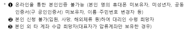 ※ 휴대폰 본인인증이 불가하여 온라인 신청 자체가 불가능하다고 인정되는 경우(①-❶,❷)에 한해, 예외적으로 2.15일(월)부터 예약을 받아 2.16일(화) 이후 방문 신청 가능