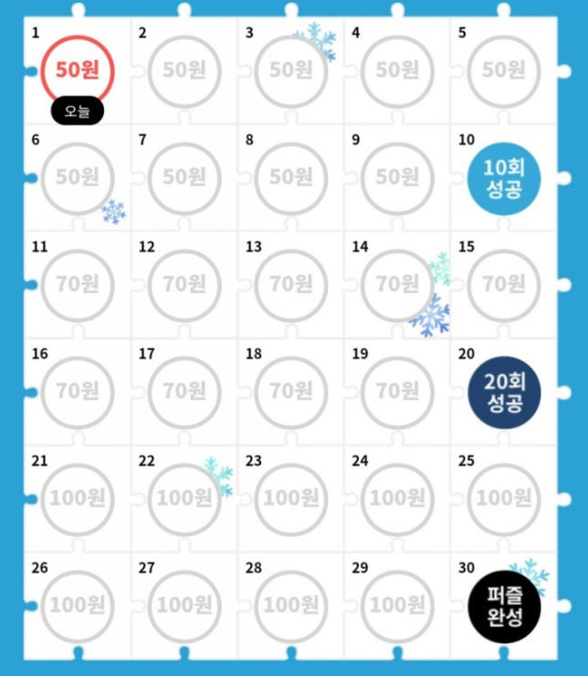 ▶ 출석체크에 해당하는 데일리퍼즐은 요렇게 하루하루 모아가시면 되는데요. 은행 어플 등은 보통 하루 30원 정도인데, 요기는 10회 성공하면 하루에 70원, 20회 성공하면 하루에 100원으로 적립금이 올라가는 포인트네요.