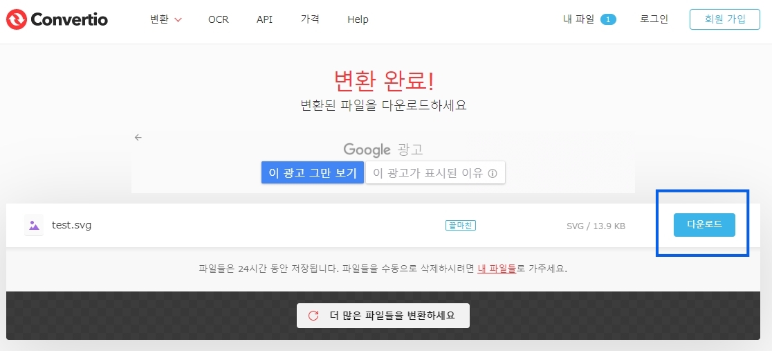 4. 변환 완료 화면이 뜨면 아래 <다운로드>를 클릭해 변환된 파일을 다운받아줍니다.