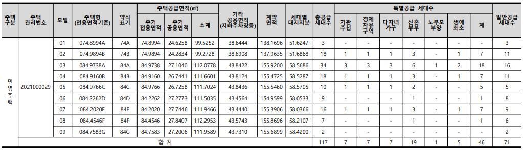 74㎡A(3세대) / 74㎡B(18세대) / 84㎡A(34세대) / 84㎡B(18세대) / 84㎡C(10세대) / 84㎡D(9세대) / 84㎡E(16세대) / 84㎡F(7세대) / 84㎡G(2세대)