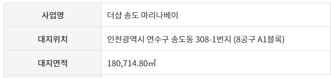 - 더샵 송도 마리나베이는 인천 연수구 송도동(인천경제자유구역)에 위치하는 더샵 송도 마리나베이 아파트이며, 시행자인 센토피아 송도랜드마크시티 지역주택조합이 사용 승인일(2020.07.13.) 완료 후, 임대 이력이 없는 공실 상태로 보유한 주택으로서 현재 상태에서의 분양이므로 반드시 공고문 및 유의사항을 숙지하여 신청하시기 바랍니다.