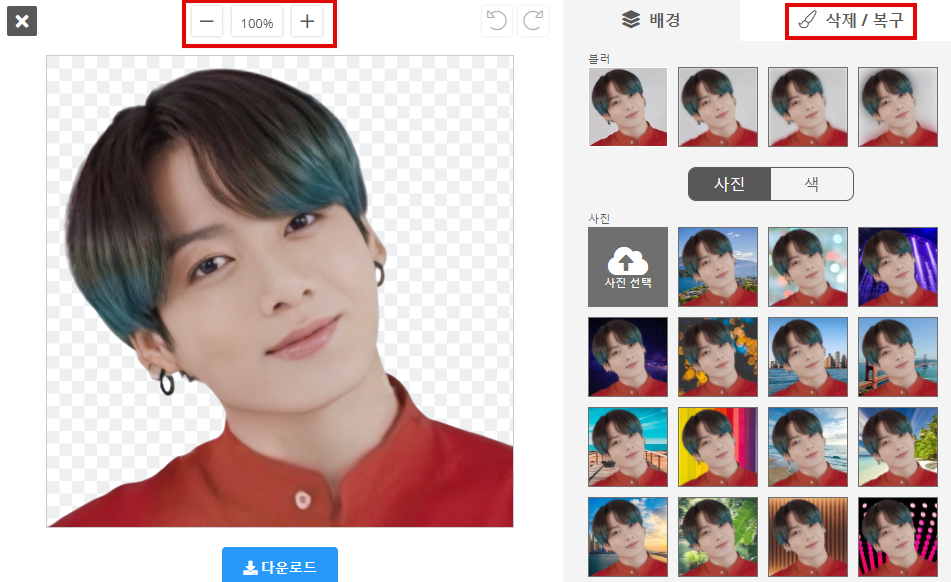 현재 사이즈로 봤을 때는 배경이 깔끔하게 지워진 것처럼 보이지만 막상 색이 있는 바탕에 배경을 지운 인물 혹은 사물 사진을 올려보면 경계선이 울퉁불퉁해보일 때가 있습니다. 그럴 때는 3)번처럼 편집 버튼을 눌러 배경과 인물의 경계선을 부드럽게 만들어줄 수 있습니다. 편집 버튼을 누르면 위와 같은 화면이 뜨는데, 좌측 상단의 <+>버튼을 눌러 이미지를 확대하고, 우측 <삭제/복구>부분을 클릭해줍니다.