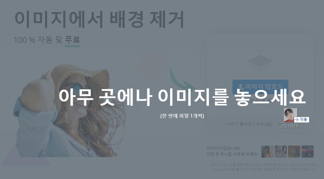 배경을 지우고자 하는 이미지를 위의 파란색 버튼을 눌러 업로드하거나, 드래그해서 아무데나 사진을 가져다 놓으면 됩니다. 사진을 드래그 했더니 아래와 같이 화면이 회색으로 변하면서 <아무 곳에나 이미지를 놓으세요>라는 메시지가 뜹니다. 한 번에 1장씩만 가능합니다.