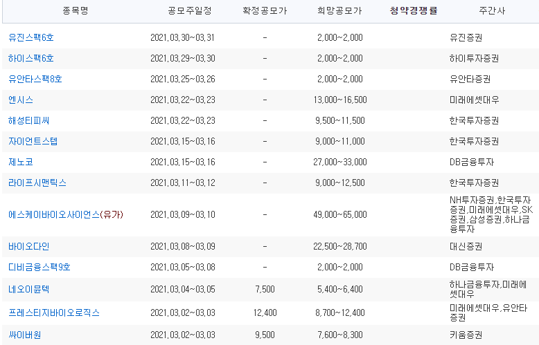 3월 공모주 일정 SK바이오사이언스 엔시스 해성티피씨 제노코 등