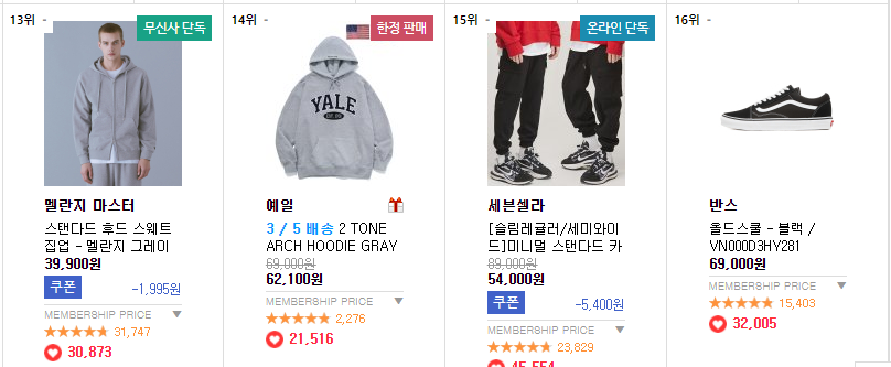 저도 무신사에서 뭐가 잘 팔리는지 천천히 함 봐야겠습니다. 가격도 비싸지 않고, 제품, 브랜드 모두 다양하고 포인트도 쏠쏠하게 모을 수 있을 것 같고... 유아인 패딩도 넘 멋진데, 이미 겨울 다 갔고... ㅎㅎ