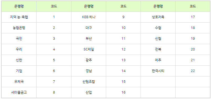 ※ 각 은행별 코드 번호