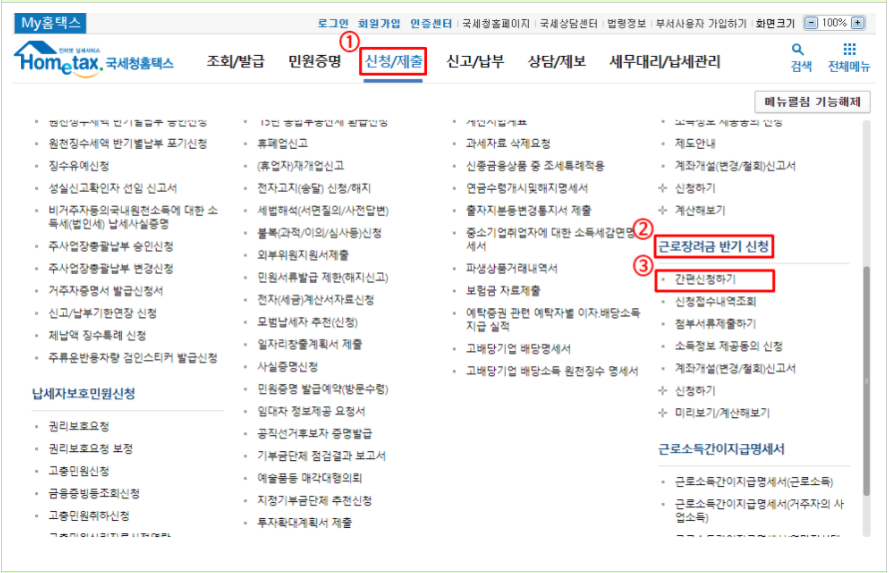 1) 홈택스 접속 → 신청/제출 → 근로장려금 반기 신청 → 간편신청하기