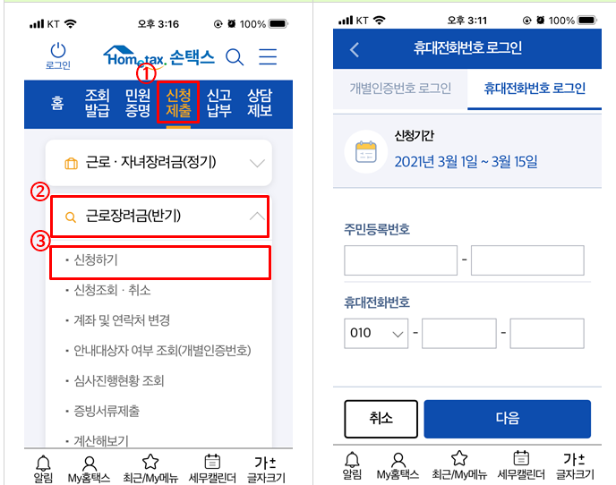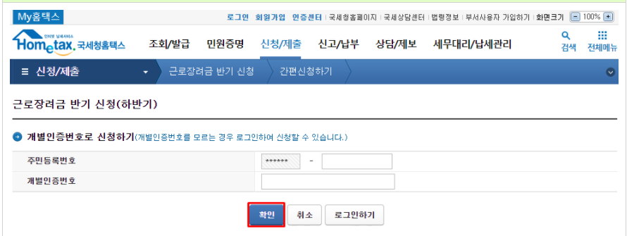 1) 홈택스 접속 → 로그인 → 신청/제출 → 근로장려금 반기 신청 → 신청하기 → 신청하기