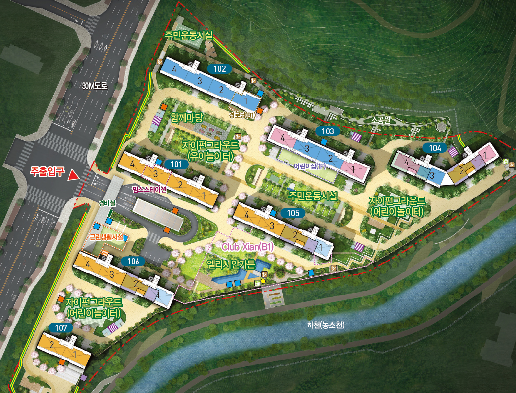 - 조경공간인 엘리시안가든, 어린이놀이터인 자이펀그라운드, 주민운동시설과 녹음 속 힐링가든인 함께마당도 조성 예정