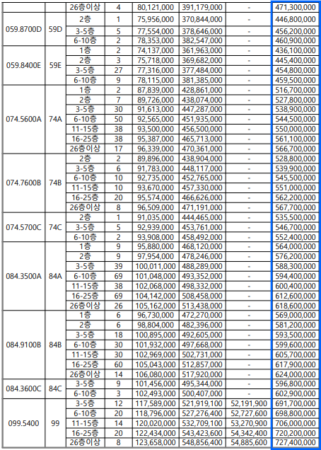 - 평당 1850만 원으로 계산할 경우, <전용 84㎡> 6억 초반 예상되고, <전용 74㎡> 5억 중반 예상, <전용 59㎡> 4억 중반 예상