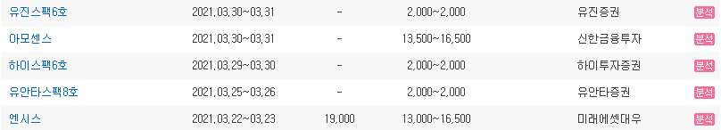 3월 넷째주는 5개의 회사에서 공개모집을 합니다. 스팩주가 3곳이고 나머지는 엔시스와 아모센스인데요. 스팩주 청약은 공모가가 2천 원인데, 일반 기업과 달라서 주가가 아주 미미하게 상승하기 때문에 공모주 청약으로 수익을 내려는 분들과는 조금 맞지 않을 수 있습니다. 그래서 스팩주는 패스하겠습니다.