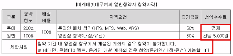 - 주관사: 미래에셋대우 (청약수수료 무료/영업점 건당 5,000원)