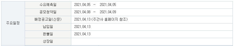 1) 수요예측발표: 21년4월7일(수) >>> 증권신고서 정정 제출 요구 받아 일정 변경되었습니다! 아래 포스팅을 참고해주세요.