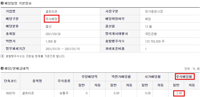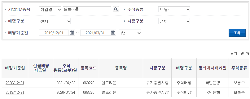 - 셀트리온은 1년에 1번 배당을 주는 것을 알 수 있습니다.