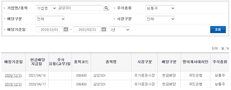 - 삼성SDI도 1년에 1번 배당을 주네요.