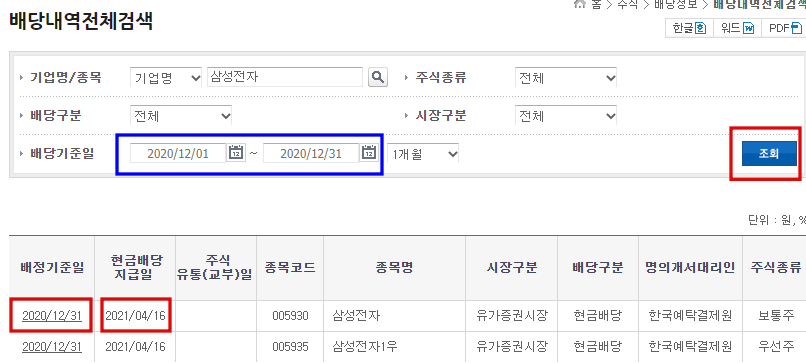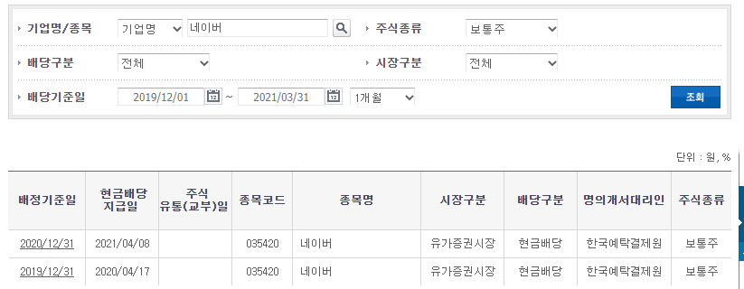 1) 배당기준일을 1년으로 두고 조회를 하시면 됩니다. (전전년도 12월을 기준으로 두고 보시면 됩니다.)
