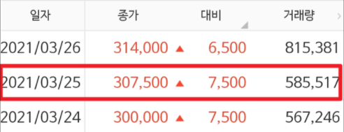 21년 3월25일 종가 307,500원을 기준으로 계산됩니다.