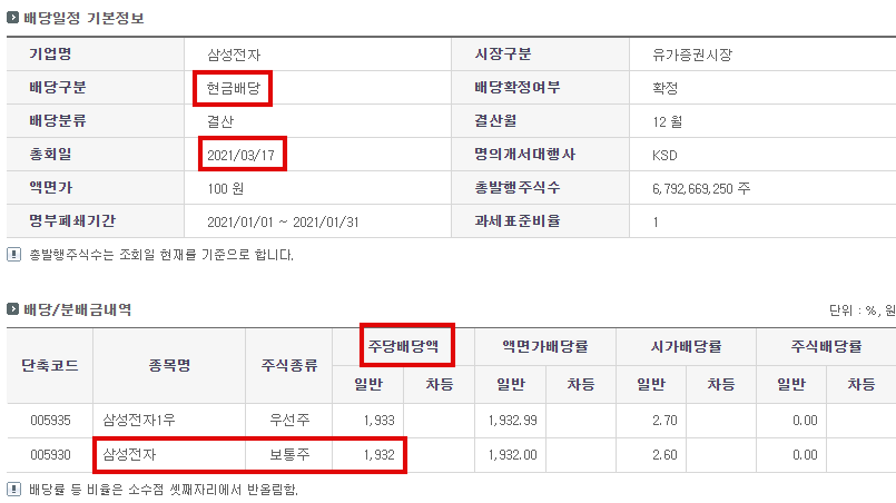 2) 삼성전자의 경우 현금배당을 하며, 주주총회가 21년3월17일에 있었으므로