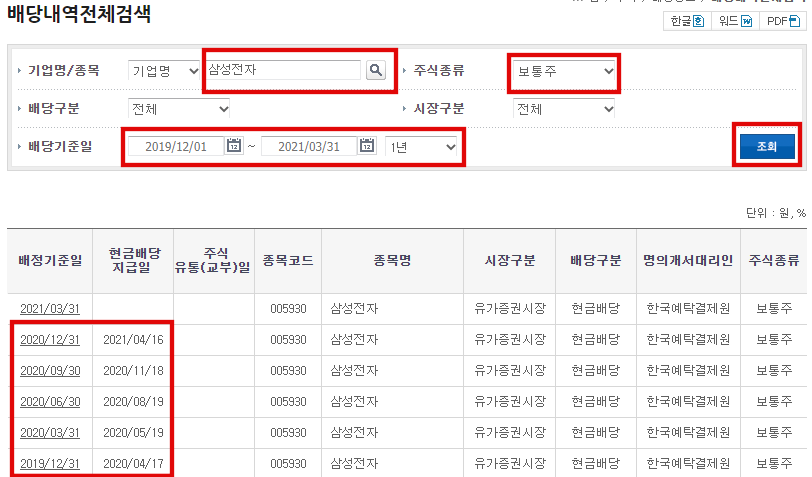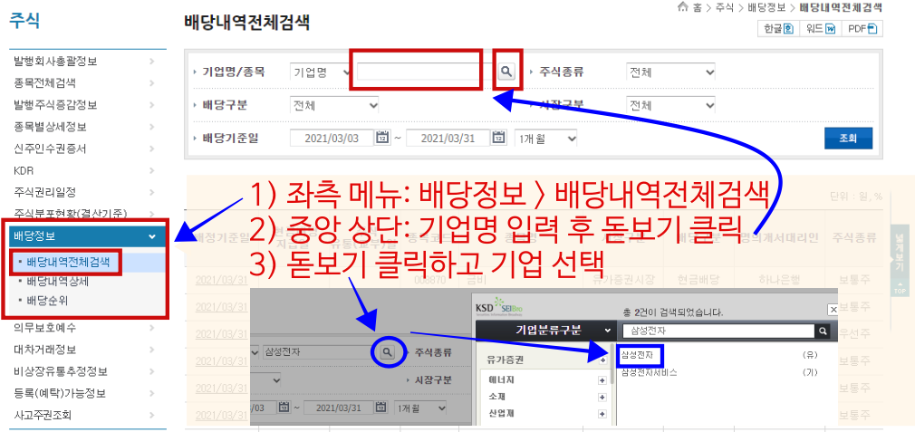 3. 배당기준일, 배당일, 상세검색