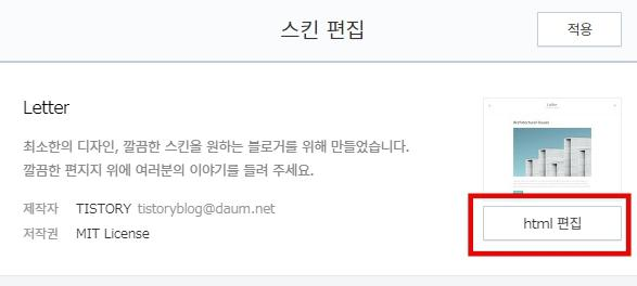 좌측 메뉴 중 꾸미기 > 스킨 편집 > html편집을 클릭합니다.