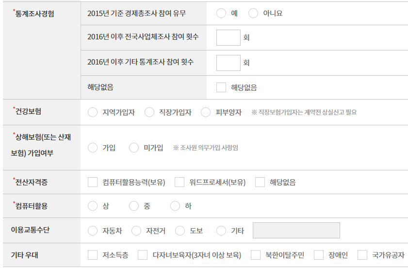 • 모집자격: 만 18세 이상이면서 조사 관련 업무에 전념할 수 있는 사람 (사업체조사 등 통계조사 경험자 우대)