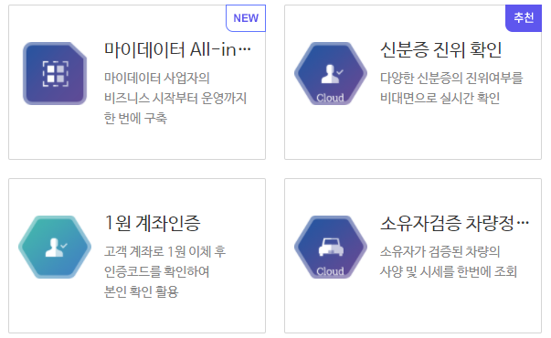 쿠콘은 금융 간편결제와 금융 거래와 조회 등의 마이데이터 관련한 다양한 API를 공급하는 기술업체입니다. 예를 들면 아래의 1원 계좌인증 보이시죠? 계좌 개설을 할 때 은행이나 증권사에서 본인 인증을 위해 1원을 입금하면서 송금명에 숫자나 단어를 넣어 인증하게 하잖아요. 그런 기술을 가진 회사였네요. 비대면 개설 시 신분증 진위 확인하는 기술도 갖고 있고, 요즘 같은 시기에 꼭 필요한 기업인 것 같습니다. 이외에도 다양한 기술을 갖고 있습니다.