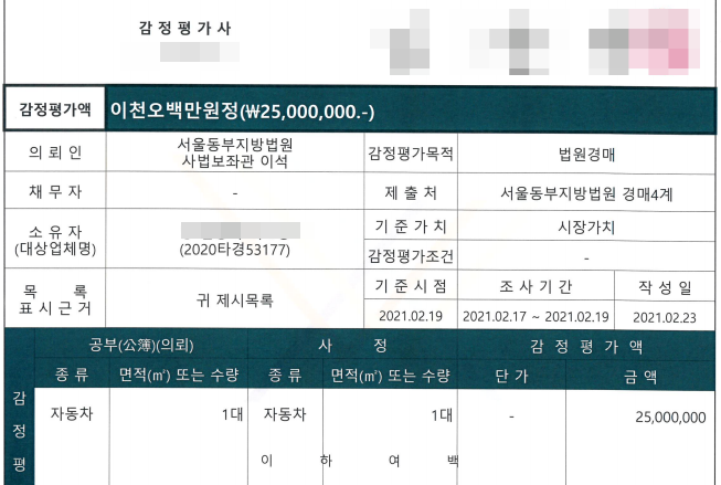 - 만약 문제가 없어보인다면 물건을 상세조회하시면 됩니다. 사진을 클릭하여 꼼꼼히 따져보시고, 감정평가서를 참고하시면 좋을 것 같네요. 위의 이미지에는 없지만 관련사진 하단에 보시면 감정평가서, 사건내역 등을 보실 수 있습니다. 감정평가서는 아래와 같이 법원이 정한 감정평가사가 자동차에 대한 감정을 하고, 감정평가액을 적어놓은 문서인데요,