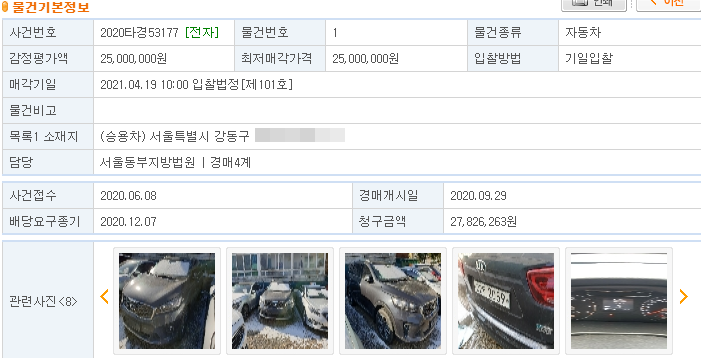 - 참고로 아래 <문건/송달내역> 탭을 클릭해서 보시면 문건처리내역이 있는데, 최초 접수일이 20년6월로 되어 있습니다. 10개월 전에 경매 접수가 되었다는 건데요. 그렇다면 지금까지 시동을 걸지 않았을 테니, 아마 배터리가 방전되었을 가능성이 큽니다. 점퍼선을 이용해 시동을 걸어야 하거나, 배터리 교체를 해야 할 수도 있으니, 그 비용도 감안하셔야 할 것 같네요.
