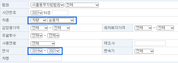 - 만약 본인이 원하는 차종, 연식, 제조사, 매각가격 등을 선택해서 검색하고 싶으면, 아래 화면에서 선택하고 검색을 하시면 됩니다. 저는 차량, 승용차, 2019~21년 연식으로 검색해보았습니다.