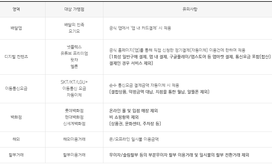 - 배달의 민족, 요기요, 넷플릭스, 유튜브 프리미엄, 왓챠, 멜론, 이동통신요금 자동이체(3사), 롯데, 현대, 신세계백화점, 해외이용거래, 할부이용거래