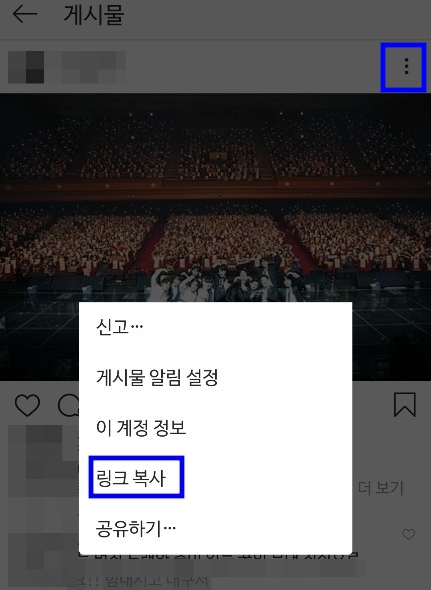 인스타에서 검색해서 나온 사진 중 원하는 사진을 우클릭 > 링크 주소 복사 클릭