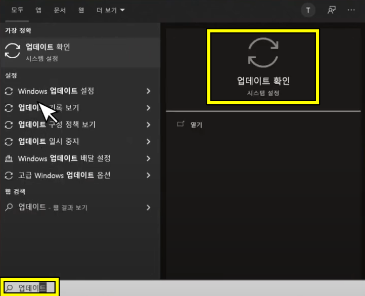 ▶ 방법: 1) 작업표시줄의 검색 버튼을 클릭하여 검색창을 열고, 업데이트로 검색해주세요.