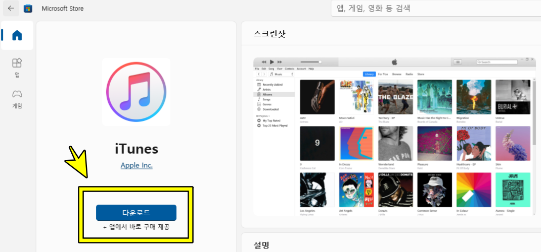 4) 아이튠즈가 검색되었다면 <다운로드> 버튼을 클릭해주세요. 인터넷 속도에 따라 다르지만 약 5분정도 소요됩니다.
