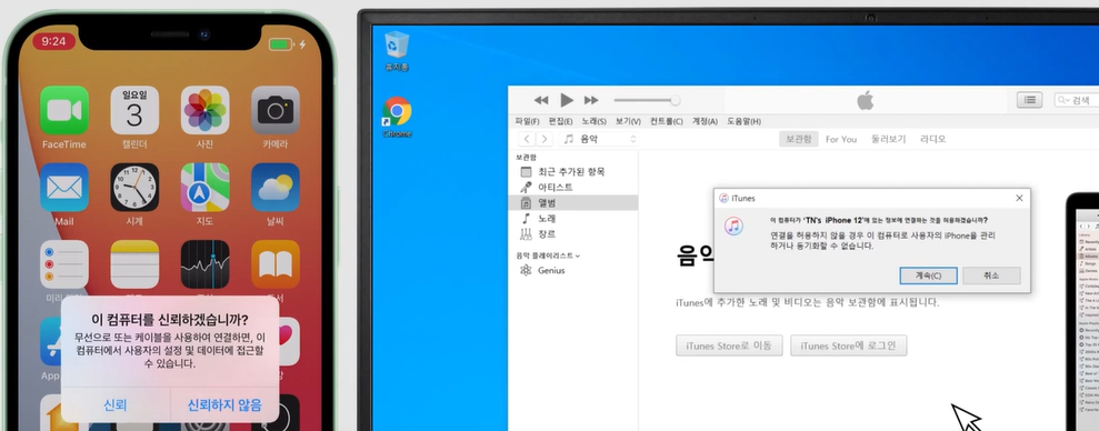 아이폰에서는 <신뢰>를 클릭하고, PC에는 <계속>을 클릭해주세요.