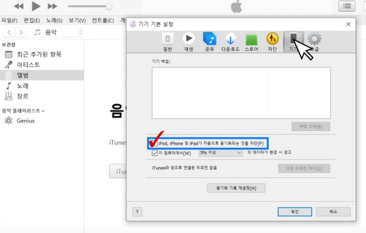 9) 기기 기본 설정 창이 뜨면 기기 클릭 - 하단의 iPod, iPhone 및 iPad가 자동으로 동기화하는 것을 차단에 체크 입력 - 확인 클릭. 이렇게 하면 아이폰이나 아이패드 등의 자료가 멋대로 동기화되어 데이터가 사라지거나 변경되는 것을 차단할 수 있습니다.