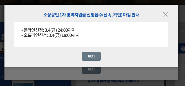 현재 소상공인 방역지원금(https://xn--ob0bku825amoe82aj1potblybi4k.kr/) 사이트에 접속하시면 아래와 같이 소상공인 1차 방역지원금 신청접수 마감 안내라는 팝업창이 떠있는데요.
