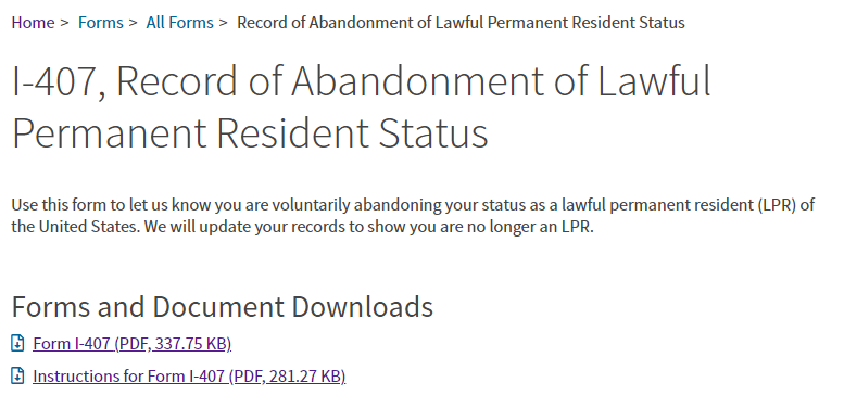 Use this form to let us know you are voluntarily abandoning your status as a lawful permanent resident (LPR) of the United States. We will update your records to show you are no longer an LPR.