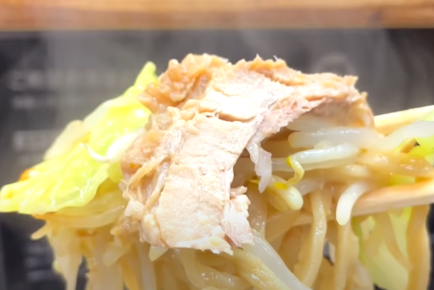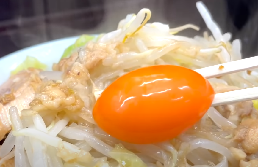 돼지고기, 채소 등 토핑을 조금 먹고 그릇에 여유가 생기면 젓가락으로 면을 들어 뒤집어주세요. 소스와 면, 달걀이 섞이면서 시루나시라면의 진가를 맛볼 수 있습니다. 小ラーメン(소자)이지만 엄청 볼륨감이 있습니다.