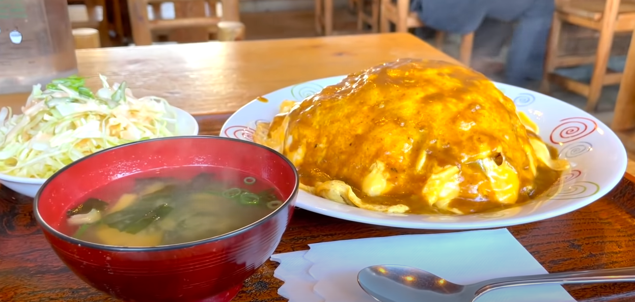일반적인 오무라이스 색이 아니지만 맛은 있습니다. 달걀이 촉촉해서 밥과 잘 어울리네요. 계속 먹다보면 조금 매운데 고춧가루의 매움이 아니라 카레의 매운 맛이라 못 먹을정도는 아닙니다. 이럴 때 함께 나온 샐러드와 미소장국으로 입을 달래보시기 바랍니다.