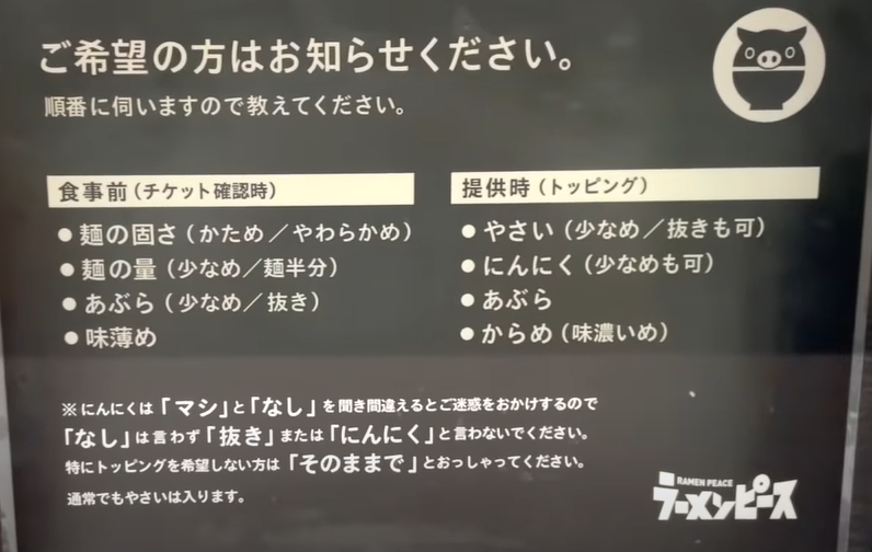 또한 면 위에 올라가는 채소를 적게 하거나 뺄 수 있고, 마늘을 적게 하거나 빼달라고 할 수도 있습니다. 특별히 주문할 게 없으면 <소노마마데>라고 하면 된다네요.
