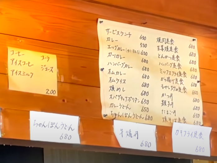 가게 안이 환해서 기분이 좋아지는 곳입니다. 메뉴는 돈카츠, 군만두, 오코노미야키 등 다양하고, 가격도 비싸지 않은 편입니다. 포장도 가능하고, 60엔을 더 내면 양배추를 추가해줍니다. 밥을 빵으로(+100엔) 바꿀 수도 있고요.