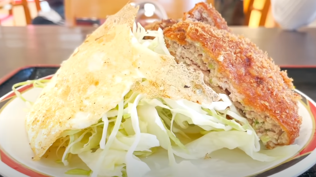 양배추를 한쪽은 달걀후라이가 다른 한쪽은 교자카츠가 덮고 있네요.