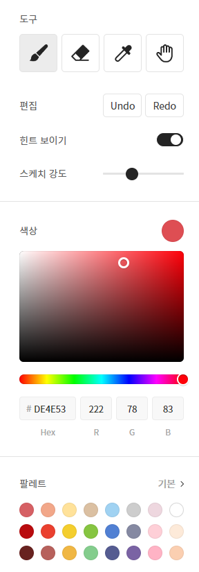 색을 잘못 골랐다고 걱정하지 마세요. 좌측 Undo 버튼이나 우측의 히스토리를 통해 다시 되돌릴 수 있습니다.