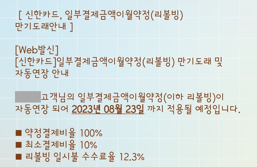 6. 위에서 즉시결제가 안 되는 이유는 <일시불>이나 <할부>를 선택했기 때문인데요, 가끔 신한카드에서 아래와 같은 문자가 오는 경우가 있습니다. 리볼빙이라는 서비스인데, 말하자면 <결제 금액 중 일부만 결제하고 나머지는 나중에 갚아, 그대신 이자는 12.3%야> 이런 서비스입니다. 카드를 만들 때 제가 이 서비스에 동의를 했겠지만 카드사에서 맘대로 자동연장을 하고 있네요. 아무튼 이 서비스에 동의하셨다면 1원이라도 카드값을 못 갚게 되면 12.3%의 수수료를 내고 카드사에서 돈을 빌려야 되는 무시무시한 서비스입니다. 만약 이 서비스에 동의하셨다면 <일시불>이나 <할부>를 선택하면 선결제가 안 됩니다.