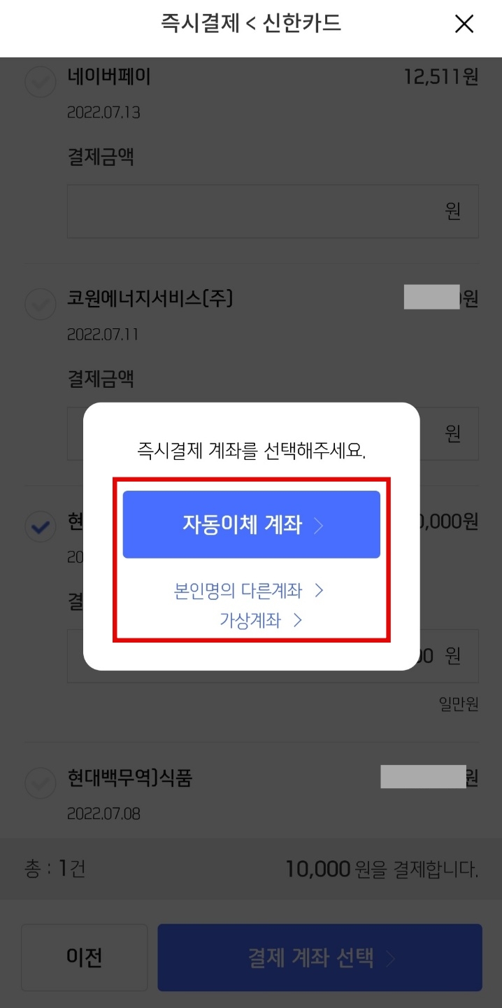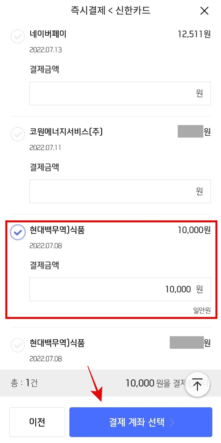 7. 카드 사용 내역 중에서 선결제하고 싶은 내역에 체크를 하면 금액이 자동입력되고, 하단의 <결제 계좌 선택>을 눌러 결제합니다.