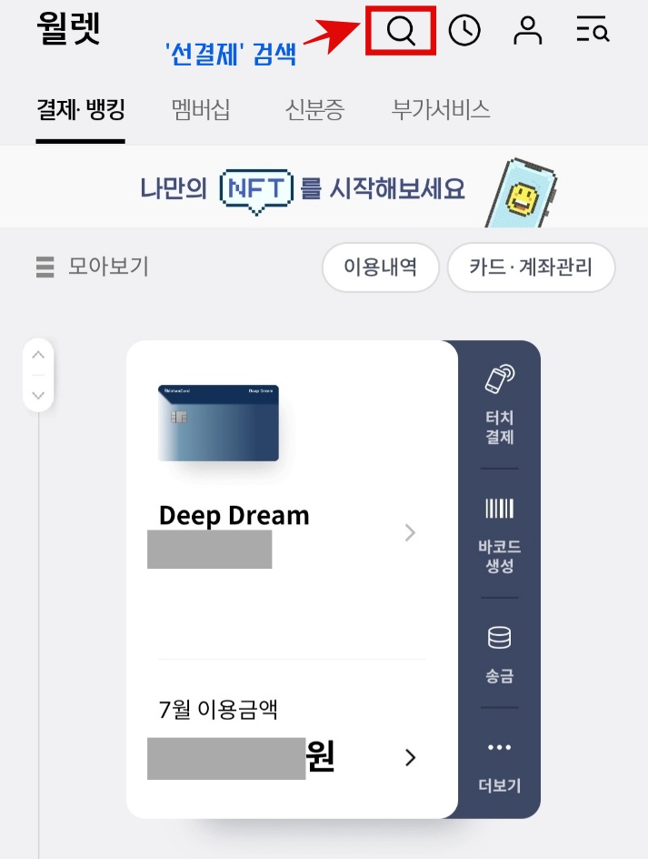 1. 먼저 신한카드 앱 (신한PLAY)에 접속하여, 돋보기(빨간색)를 클릭 후, '선결제'를 검색합니다.