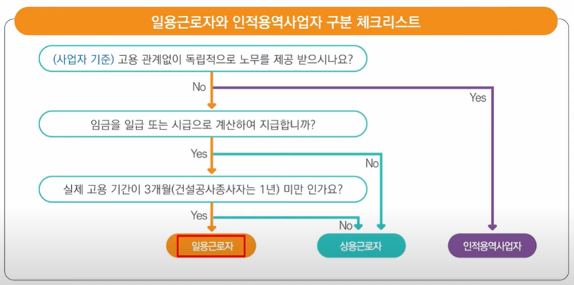 일용근로자는 1일 또는 시간으로 급여를 계산하여 지급받는 근로자로(일당, 파트타임, 아르바이트 등) 동일 고용주에게 3월(건설공사 종사자는 1년) 이상 계속 고용되어 있지 않은 근로자를 말합니다. 일용근로자와 인적용역사업자는 헛갈리기 쉬우므로 위의 체크리스트를 확인 후 지급명세서를 작성해주세요.