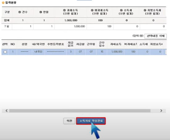 위 항목들을 정확히 입력했다면 하단의 파란색 <등록하기> 버튼을 클릭해주세요. 그럼 아래와 같이 하단에 방금 입력한 일용근로자의 근로소득 내용이 목록에 추가됩니다. 고용한 일용근로자를 차례대로 동일한 방법으로 입력하면 됩니다. 입력이 완료되었다면 하단의 <소득자료 작성완료>를 눌러주세요.