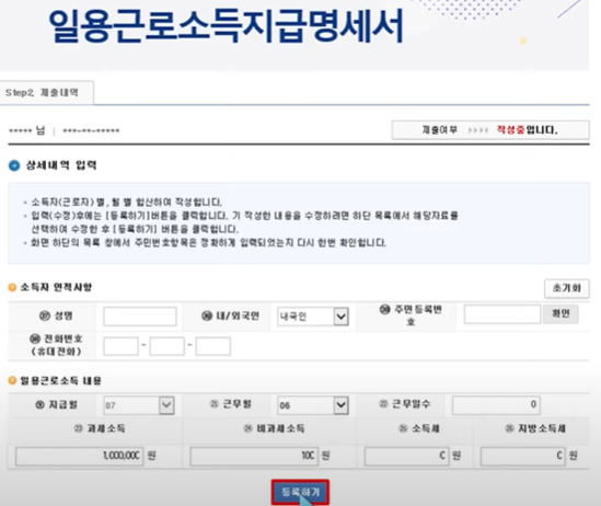 5. 일용근로소득지급명세서 작성 상세내역 입력 화면